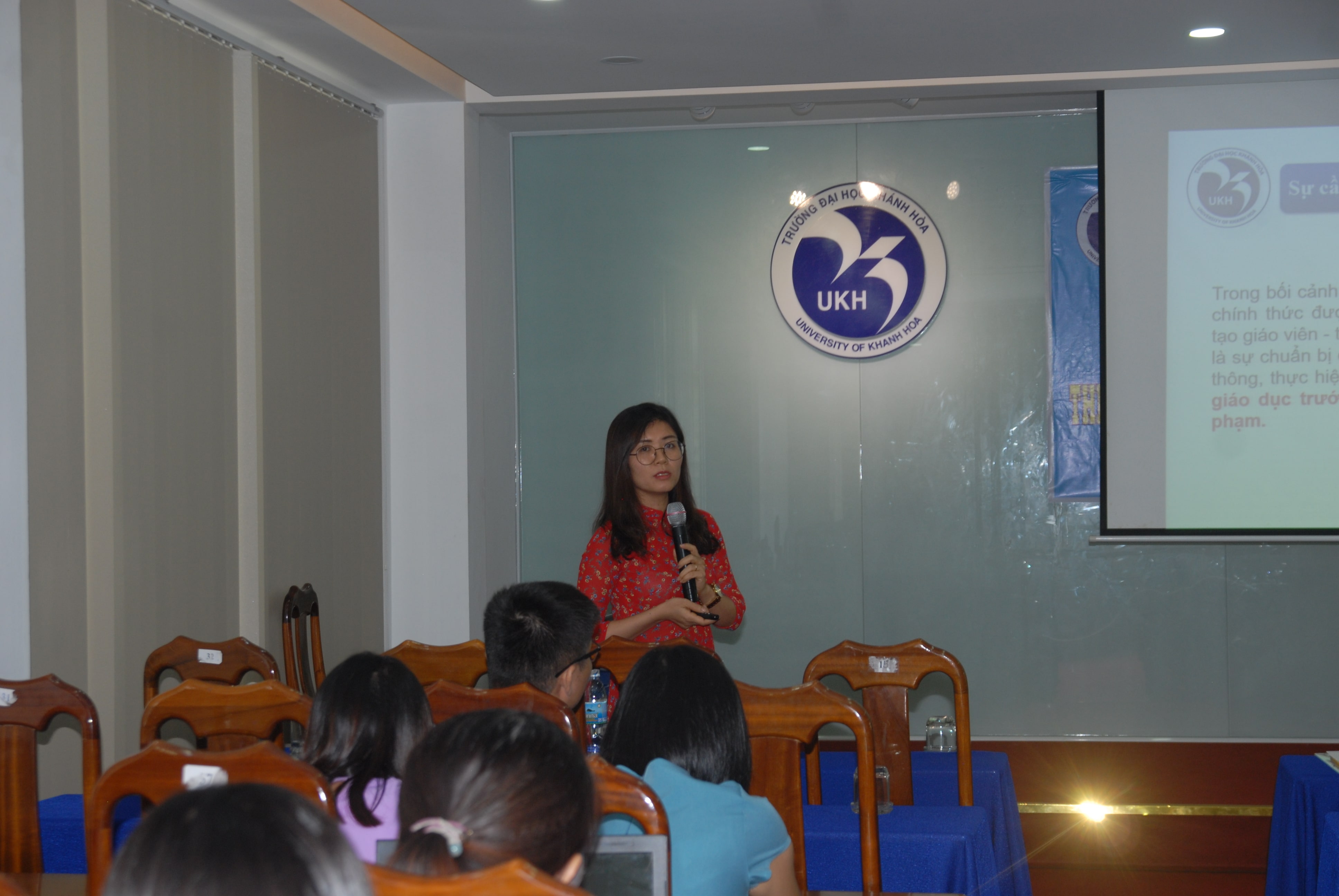ThS. Đỗ Thị Thu Huề báo cáo rà soát, phát triển chương trình đào tạo ngành sư phạm tiếng anh (tiểu học) của khoa ngoại Ngữ - Trường Đại Học Khánh Hòa.
