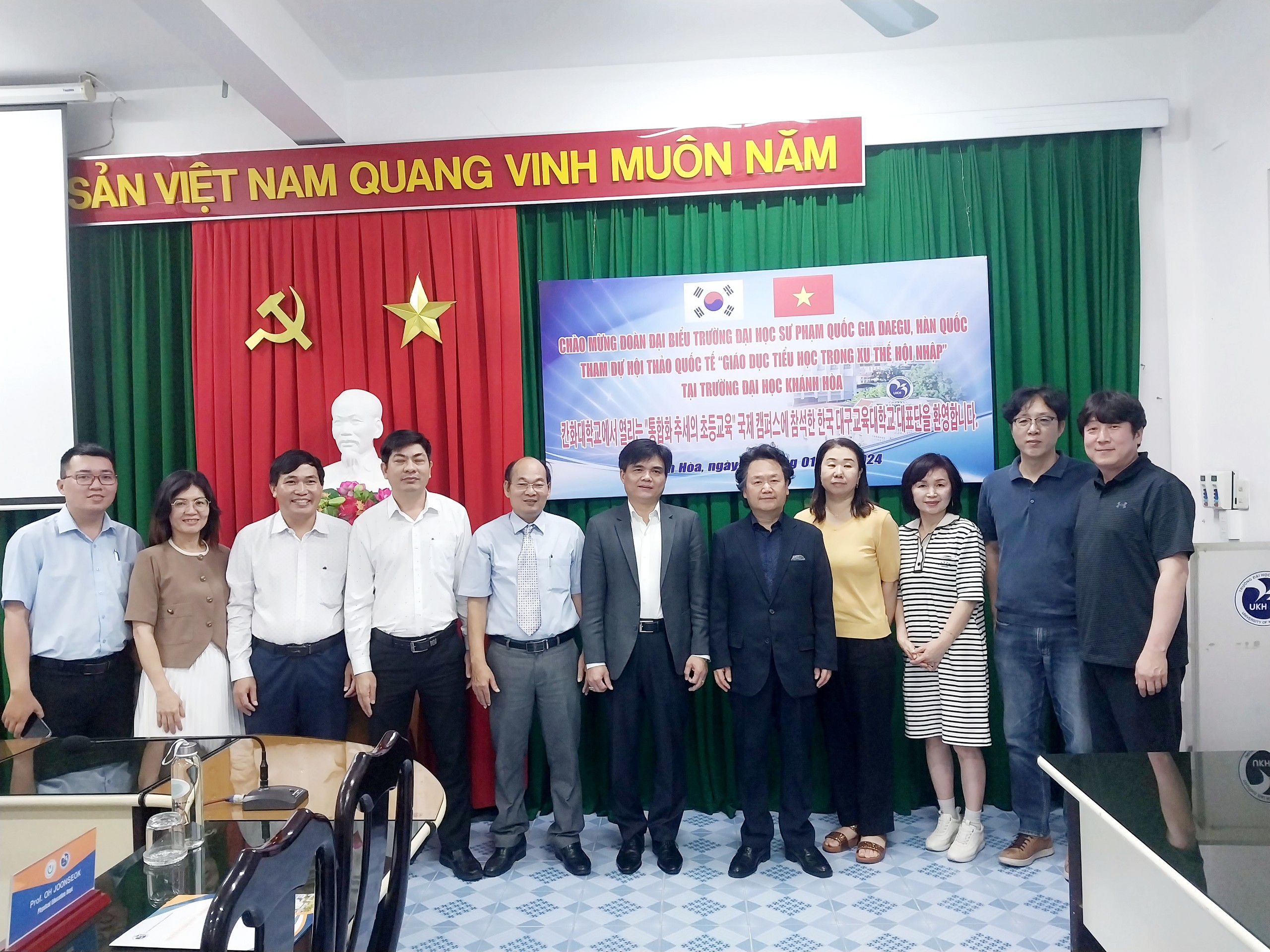 Chiều ngày 09/01/2024, tại phòng họp 1, Trường Đại học Khánh Hòa đã long trọng tổ chức tiếp đón Đoàn đại biểu Trường Đại học Sư phạm Quốc gia Daegu, Hàn Quốc tham dự Hội thảo Quốc tế “Giáo dục tiểu học trong xu thế hội nhập”.