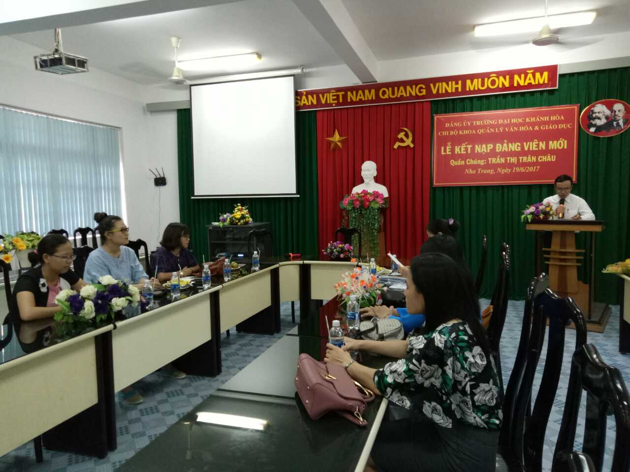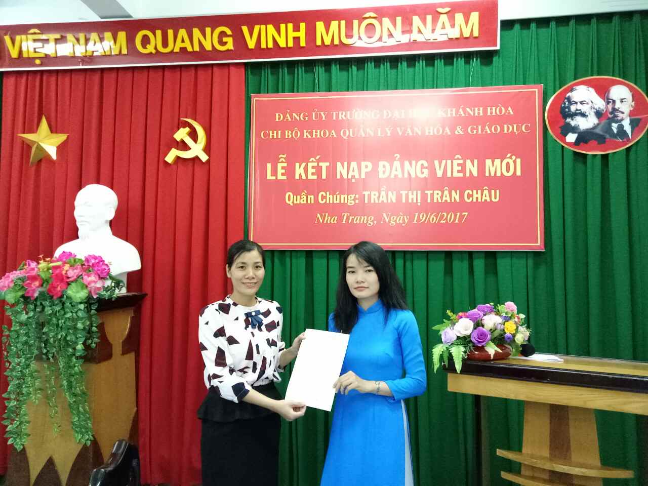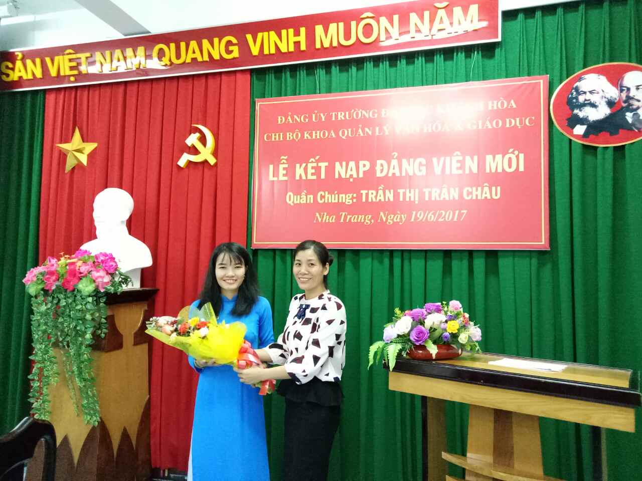 Thực hiện Quyết định 01 – QĐ/ĐU ngày 13 tháng 06 năm 2017 của Ban thường vụ Đảng ủy trường Đại học Khánh Hòa, chiều ngày 19/06/2017, Chi bộ Khoa Quản lý Văn hóa và Giáo dục đã tiến hành tổ chức Lễ kết nạp đảng viên mới đối với quần chúng ưu tú Trần Thị Trân Châu.