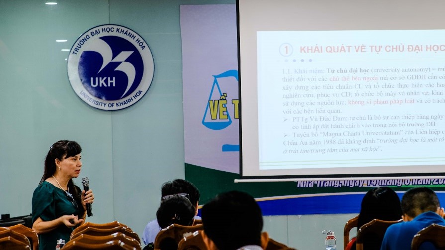 Với mục đích bồi dưỡng kiến thức “Tổng quan về tự chủ đại học, Luật Giáo dục đại học và Nghị định số 99/2019/NĐ-CP” cho đội ngũ cán bộ, giảng viên của Trường Đại học Khánh Hòa, Hội nghị đã mời TS. Nguyễn Thị Kim Phụng – Nguyên Vụ trưởng Vụ Giáo dục đại học, hiện là Giám đốc Công ty Luật TNHH Kim Phụng và cộng sự tham gia với vai trò là Báo cáo viên Hội nghị.