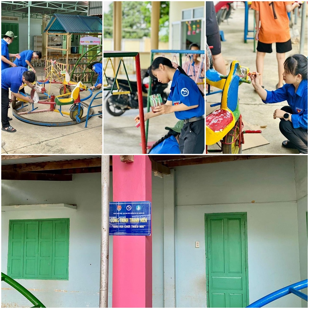 Hình 4. Các chiến sỹ Mùa hè xanh UKH tu sửa khu vui chơi cho trẻ em Trường Mầm non Vành Khuyên.