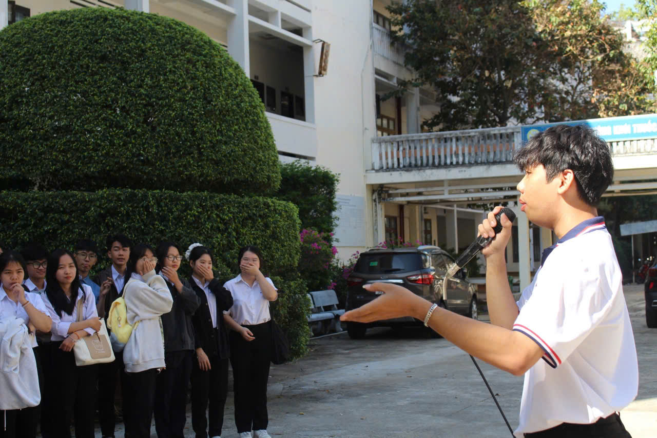 Cũng tại chương trình, đại diện nhóm SV ngành Việt Nam học (Văn hóa – Du lịch) đã thực hành kỹ năng nghề hướng dẫn du lịch. Với sự chuyên nghiệp trong quá trình tái hiện thành hướng dẫn viên du lịch của các anh chị SV, các em học sinh đã được hóa thân thành du khách thăm quan khuôn viên Trường Đại học Khánh Hòa, qua đó các em cũng hình dung phần nào về ngành học và vị trí việc làm của ngành.