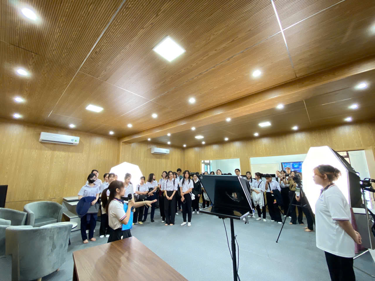 Một trong những điểm đến hấp dẫn trong buối tư vấn hướng nghiệp chính là phòng Truyền thông Đa phương tiện của khoa – nơi các em sẽ được thỏa sức thực hành và sáng tạo nếu chọn khối ngành Báo chí – Truyền thông của khoa. Tại đây, đại diện nhóm SV ngành Văn hóa học (Văn hóa – Truyền thông) giới thiệu tổng quát về phòng Truyền thông Đa phương tiện cũng như chức năng của các thiết bị trong phòng phục vụ cho các ngành đào tạo tại Khoa. Ở “thánh địa” thực hành này, học sinh được nghe giới thiệu về: phòng chụp hình với đầy đủ máy ảnh, đèn chiếu sáng, phông nền đa dạng giúp các bạn thỏa sức sáng tạo, chụp ảnh báo chí, quảng cáo hay làm các bộ ảnh truyền thông chuyên nghiệp. Đặc biệt, còn có micro và một số dụng cụ hỗ trợ giúp các bạn thử sức làm phóng viên ảnh thực thụ. Tiếp theo là Phòng quay hình - nơi các bạn có thể hóa thân thành MC, Biên tập viên hay Phóng viên. Khu vực này có đầy đủ bàn ghế cho phỏng vấn, phóng sự, bàn tin tức với máy hỗ trợ nhắc chữ giúp các bạn dễ dàng dẫn chương trình mà không lo quên lời. Không chỉ thế, còn có không gian dành riêng cho Phát thanh viên với hệ thống loa, micro và bộ xử lý âm thanh hiện đại. Phía ngoài, các bạn sẽ thấy hệ thống xử lý âm thanh chất lượng cao, kết hợp với dàn máy tính cấu hình mạnh chuyên dùng cho biên tập, dựng video, xử lý hậu kỳ và hỗ trợ thiết kế bài giảng E-learning.