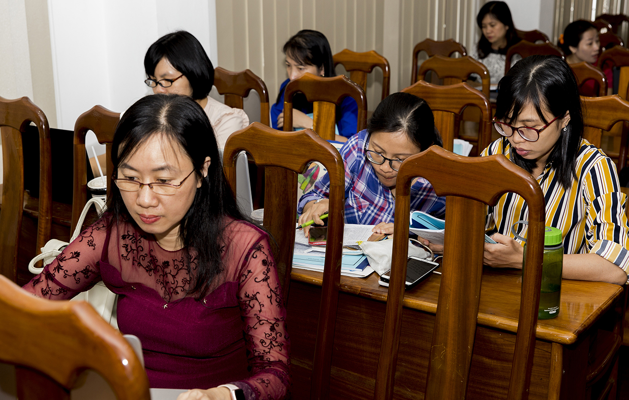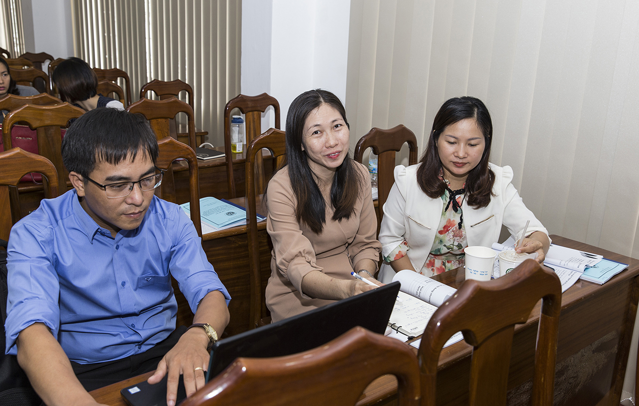 Sau khi được hướng dẫn sử dụng bộ tiêu chuẩn đánh giá chất lượng chương trình đào tạo, lớp tập huấn được chia thành các nhóm thực hành phân tích những điểm mạnh, tồn tại theo các mốc chuẩn của từng tiêu chí.