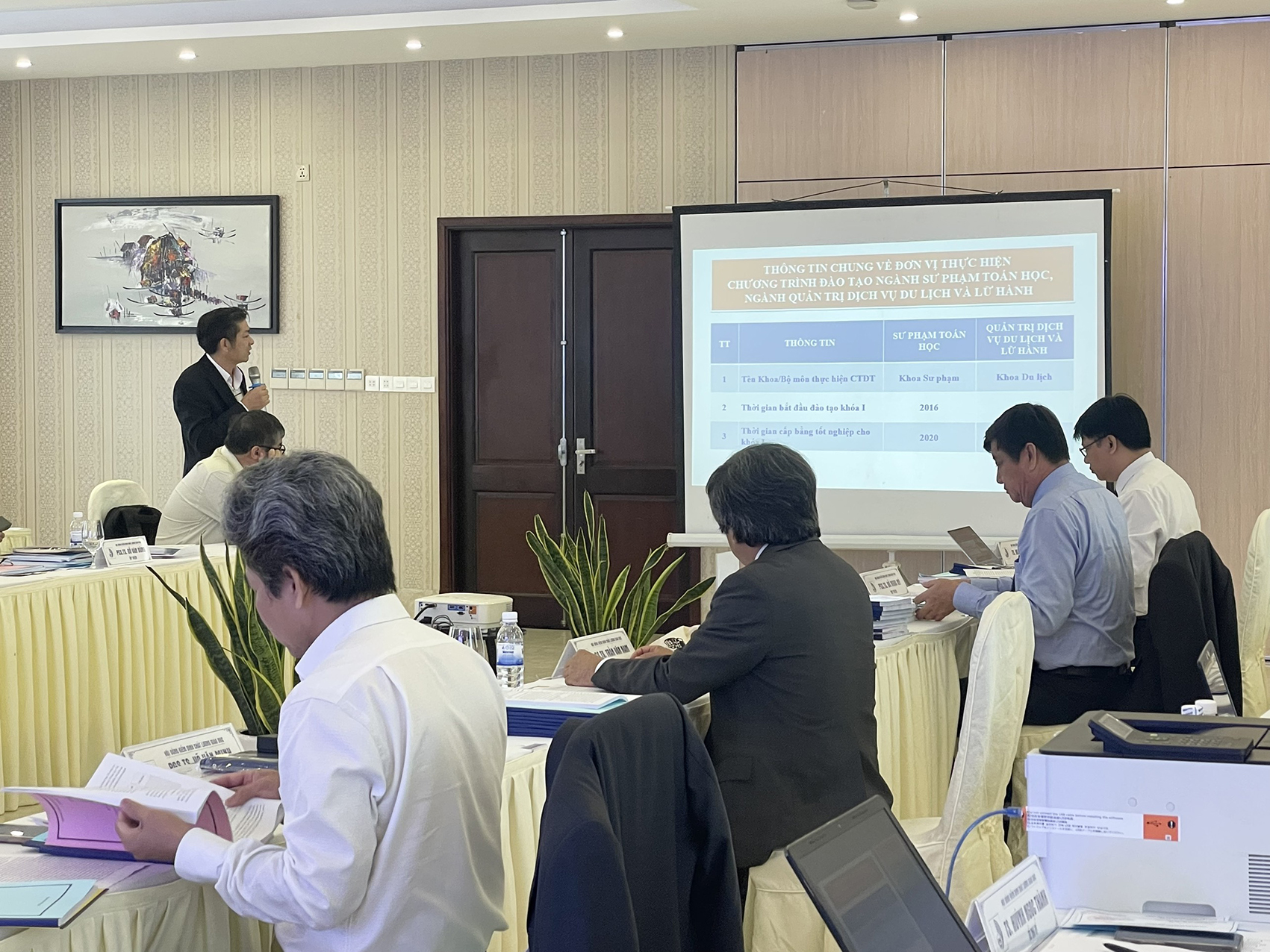 Tại phiên họp, thay mặt lãnh đạo Trường Đại học Khánh Hòa, TS. Trần Viết Thiện - Phó hiệu trưởng Nhà trường đã báo cáo tóm tắt kết quả tự đánh giá chất lượng 2 CTĐT trình độ đại học ngành Sư phạm Toán học, ngành Quản trị dịch vụ du lịch và lữ hành. TS. Trần Viết Thiện cũng đã nhấn mạnh những hoạt động cải tiến của Nhà trường đã và đang triển khai thực hiện để phát huy những điểm mạnh, khắc phục những tồn tại đã được chỉ ra sau quá trình tự đánh giá.