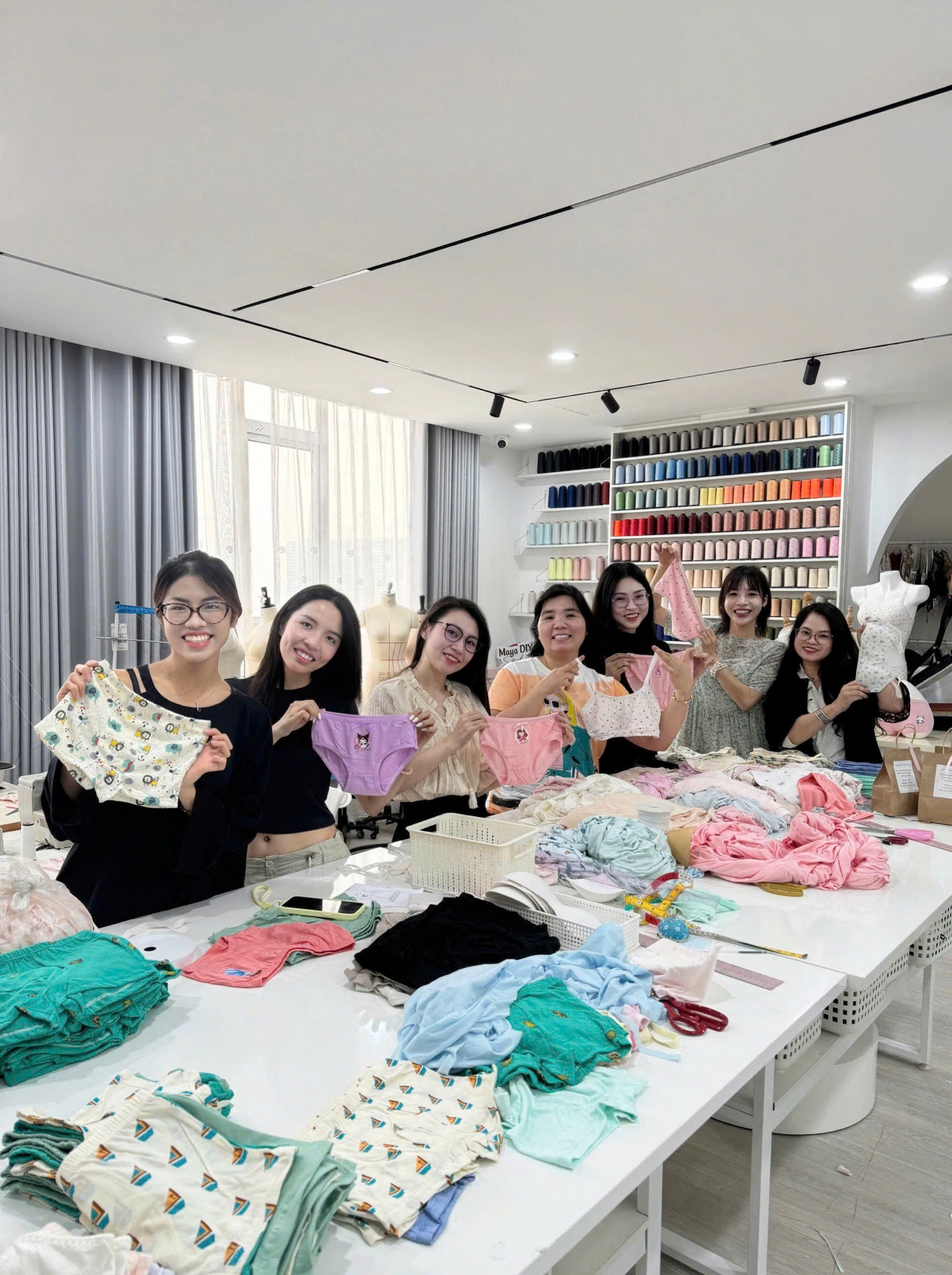 Tại Hà Nội, thỉnh thoảng chị tập hợp mọi người nơi chị làm việc để cùng nhau cắt may đồ lót cho các bé. Với các chị em ở xa, chị May gửi rập mẫu và video hướng dẫn chi tiết, hỗ trợ online trong quá trình cắt may. Mọi người chỉ cần làm theo hướng dẫn là ra được sản phẩm dễ dàng theo đúng thông số độ tuổi.
