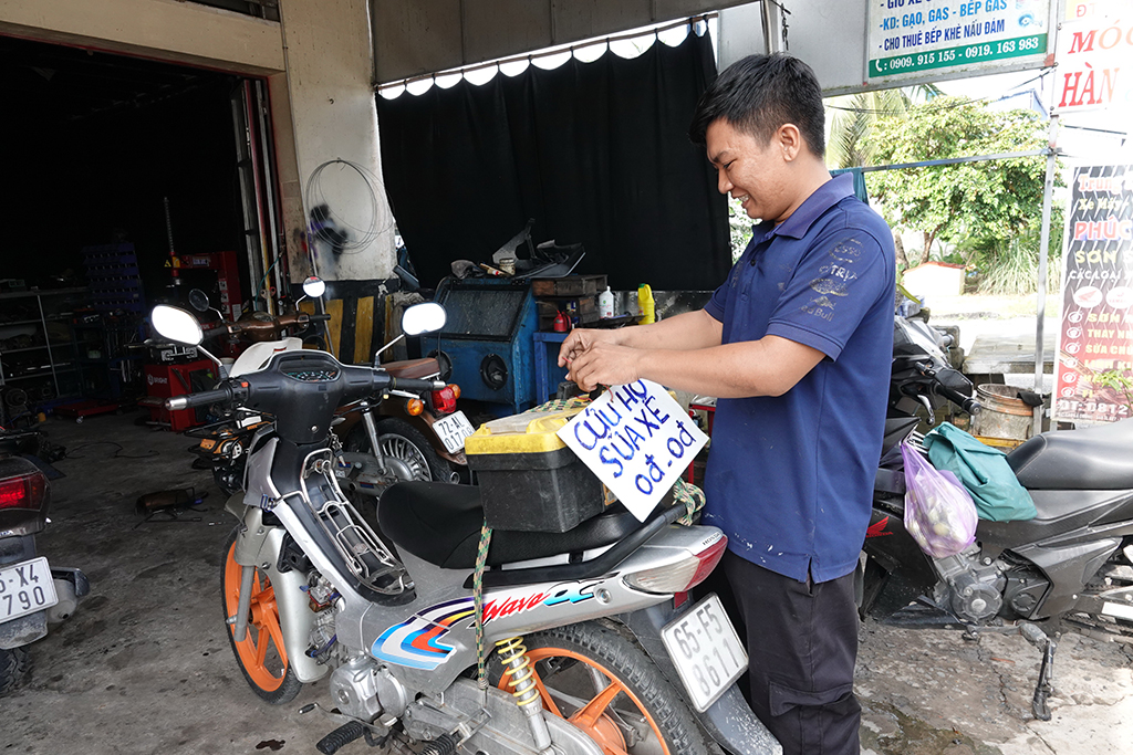 Mỗi ngày, anh mang theo hộp dụng cụ đồ nghề, can xăng, vỏ xe treo lủng lẳng trên xe, chạy từ trung tâm TP.Cần Thơ ra các tuyến QL1, QL61… thậm chí sang cả Vĩnh Long, Cà Mau, nếu có người gọi cần hỗ trợ.