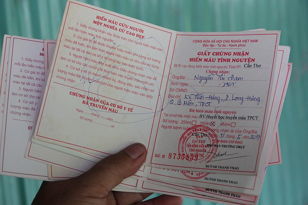 Thời gian gần đây, do cuộc sống khó khăn, vợ chồng chị An đi Bình Dương làm công nhân, chỉ còn bà Đạm và anh Tuấn duy trì việc hiến máu. Xòe những tấm giấy chứng nhận hiến máu tình nguyện, bà Đạm nói vui: "Tôi tuổi cao, nhưng còn hiến máu được. Máu sạch, máu khỏe đây. Đều đặn 3 - 4 tháng tôi hiến máu 1 lần. Gia tài của tôi là những tấm giấy chứng nhận này. Tôi cất giữ rất cẩn thận, xem như kỷ niệm quý của mình".